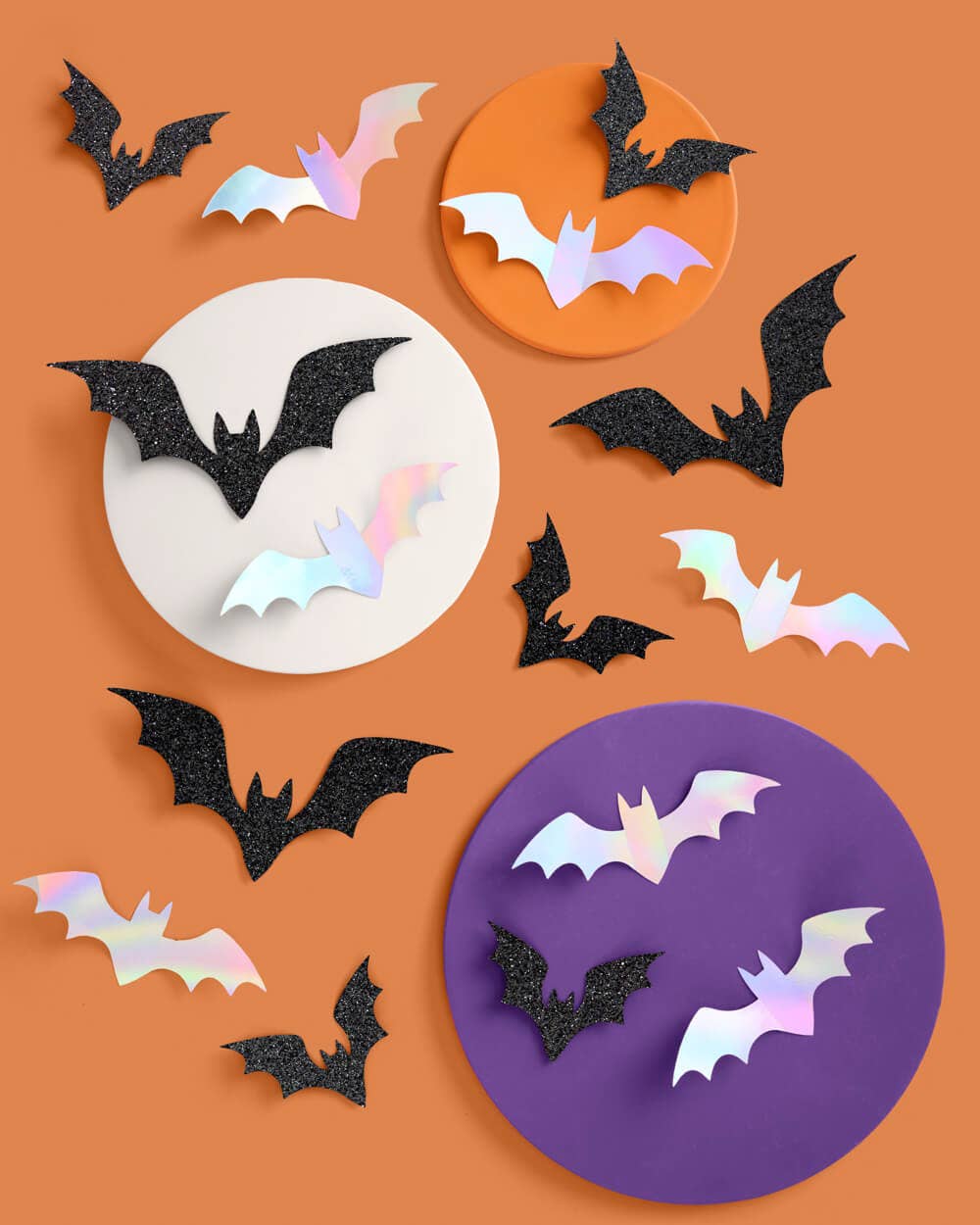 20 silver iridescent 5.75x2 in, 15 black glitter 3.75x2.6 in + 15 black glitter 7.25x3.4 in bats